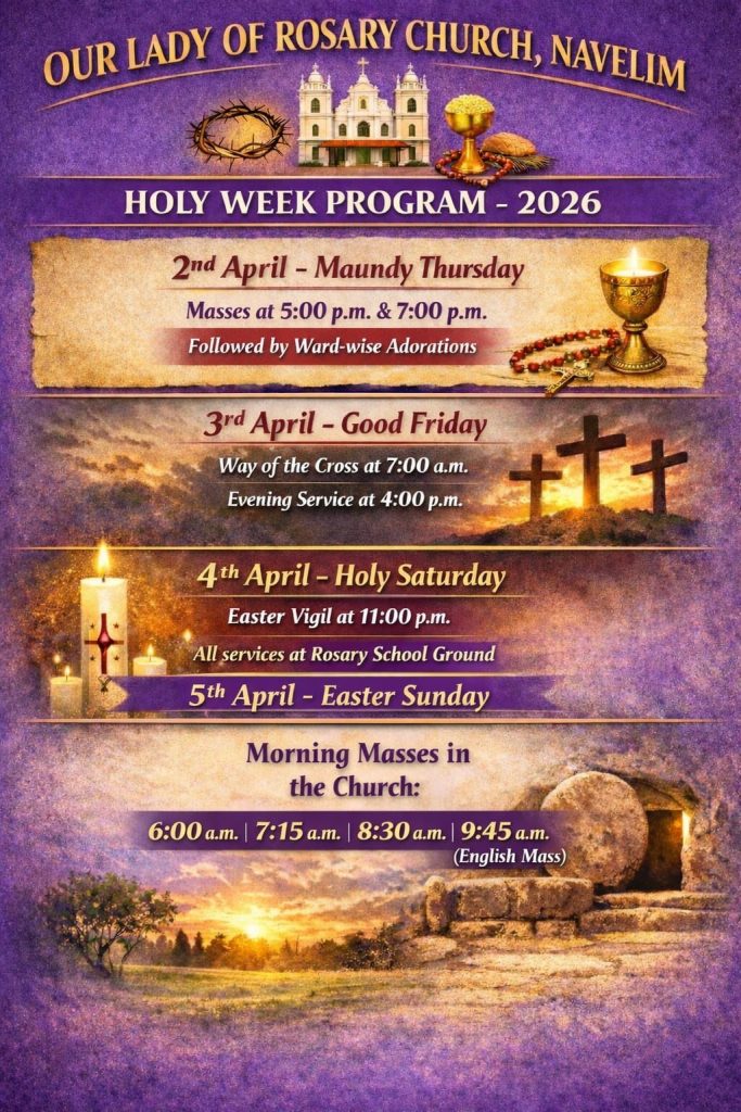 | 05.04.2026 | Sun | CELEBRATION OF THE RESURRECTION OF OUR LORD (EASTER) There will be Masses in all Chapels. No evening Mass. | Masses in the Church: 06:00 a.m. 07:15 a.m. 08:30 a.m. 09:45 a.m. (Eng) |